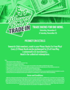 Saturday, November 8th and Tuesday, November 25th. 8AM – 12AM Rewards Club members, cash in your Player Bucks for Free Play! Every $1 Player Buck can be exchanged for $1 of Free Play (redeemed in $5 increments). Head in for unlimited redemptions.