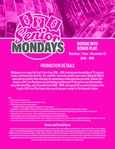 All players can enjoy Hot Seat Trivia from 1PM – 6PM, testing your knowledge of TV, movies, music, and more from the 60s, 70s, and 80s. Two lucky winners every hour will grab $100 in cash and can double their winnings by answering a trivia question correctly. Seniors 50+ receive a $10 Free Play bonus by activating your Rewards Club card at any slot machine every Monday!